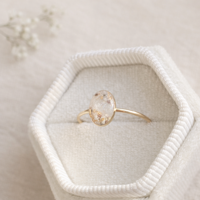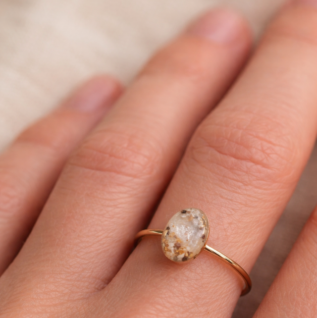 Den ovale formen gir et balansert uttrykk og gjør ringen vakker alene og med andre delikate ringer. Ringen kan lages med eller uten morsmelk og tilpasses med små, personlige detaljer som gjør hvert smykke helt unikt.
