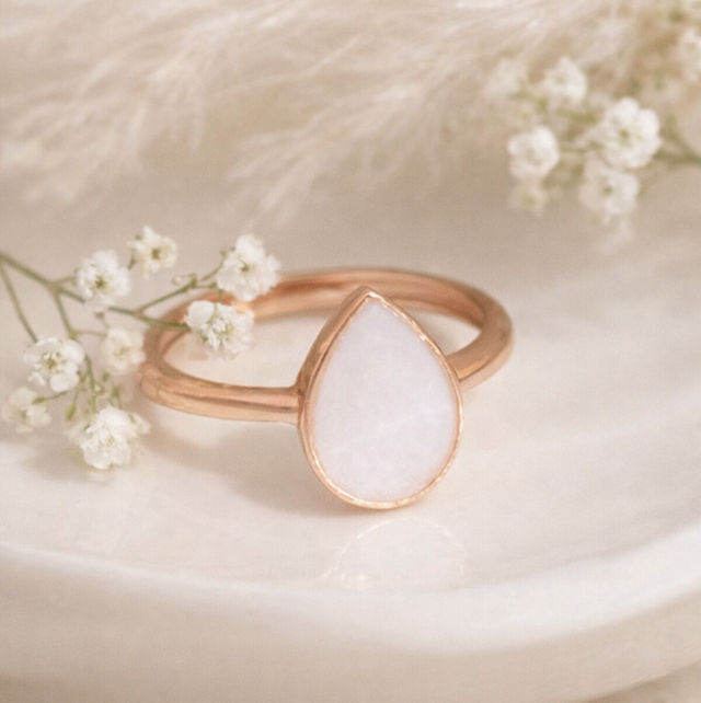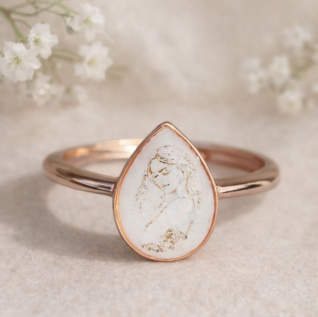 Den dråpeformede innfatningen symboliserer morsmelk og livets begynnelse. Ringen kan lages med eller uten morsmelk og tilpasses med personlige detaljer.