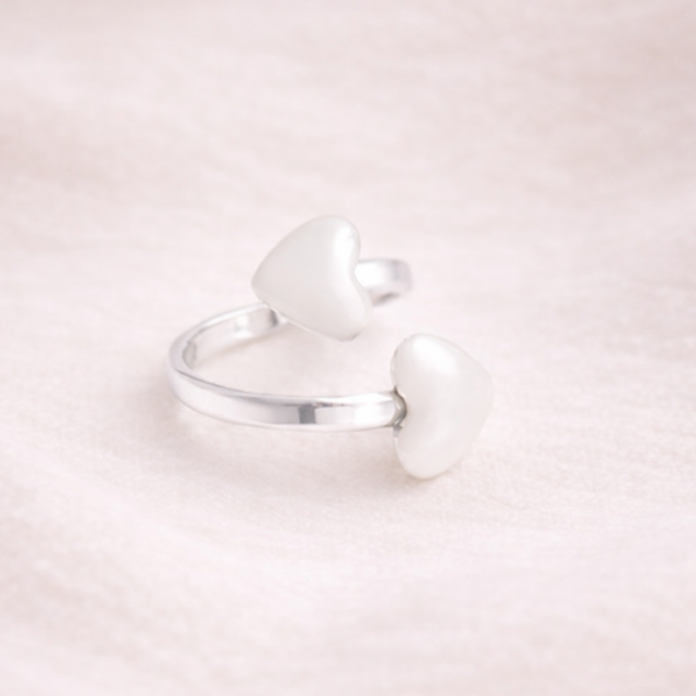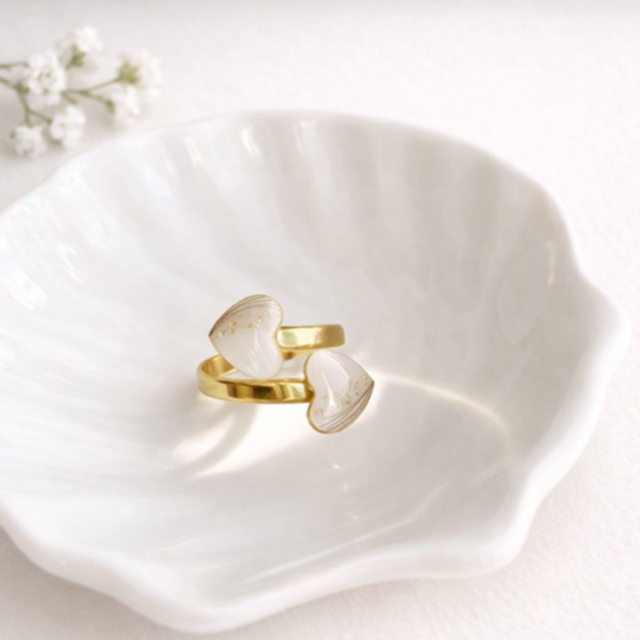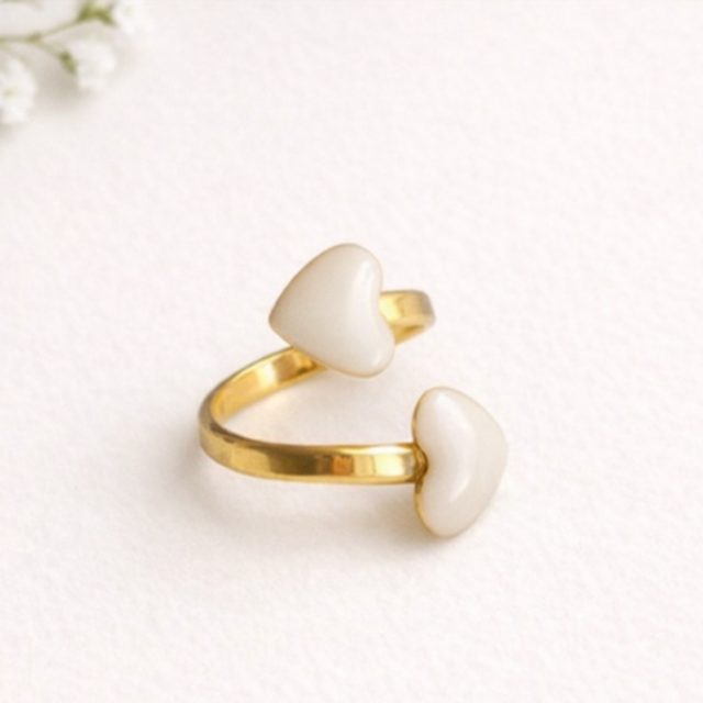 Denne ringen symboliserer et bånd som varer. To åpne hjerter, vendt mot hverandre, forent av gull og adskilt av rommet som trengs for å puste og vokse. Et delikat smykke som feirer kjærlighet, nærhet og ømhet i dype forbindelser.