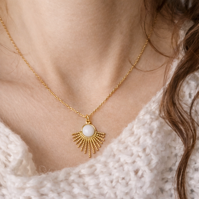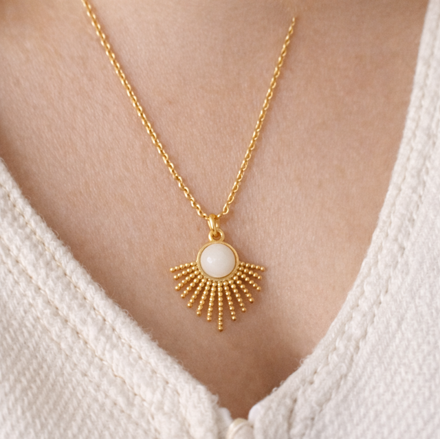Dette bohemske smykket, som en liten sol båret nært hjertet, symboliserer varme, liv som stråler, og den stille styrken man bærer i seg, selv i livets mest sårbare øyeblikk.
